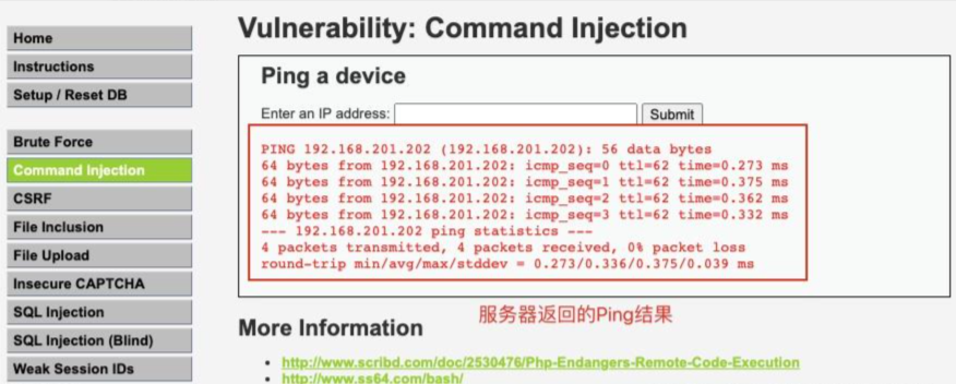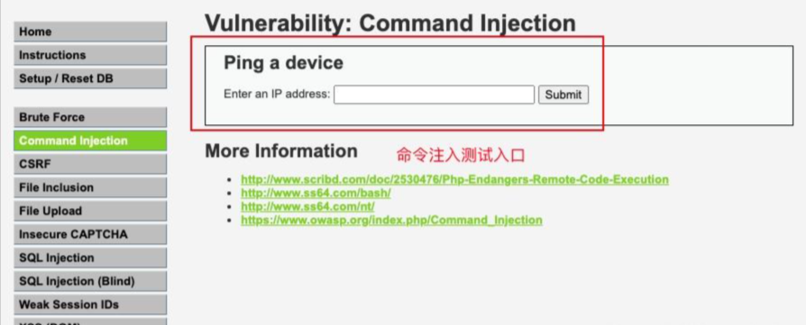 DVWA最新版默认提供了14种不同Web漏洞的测试演练, 点击左边的漏洞场景按钮, 右边会出现提供给测试人员输入的界面,在其中输入一些攻击指令,便可以看到漏洞执行效果,首先看一下命令注入漏洞的界面, 如图所示: