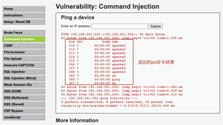 注入代码: 192.168.201.202 & ps, 返回的结果如图: